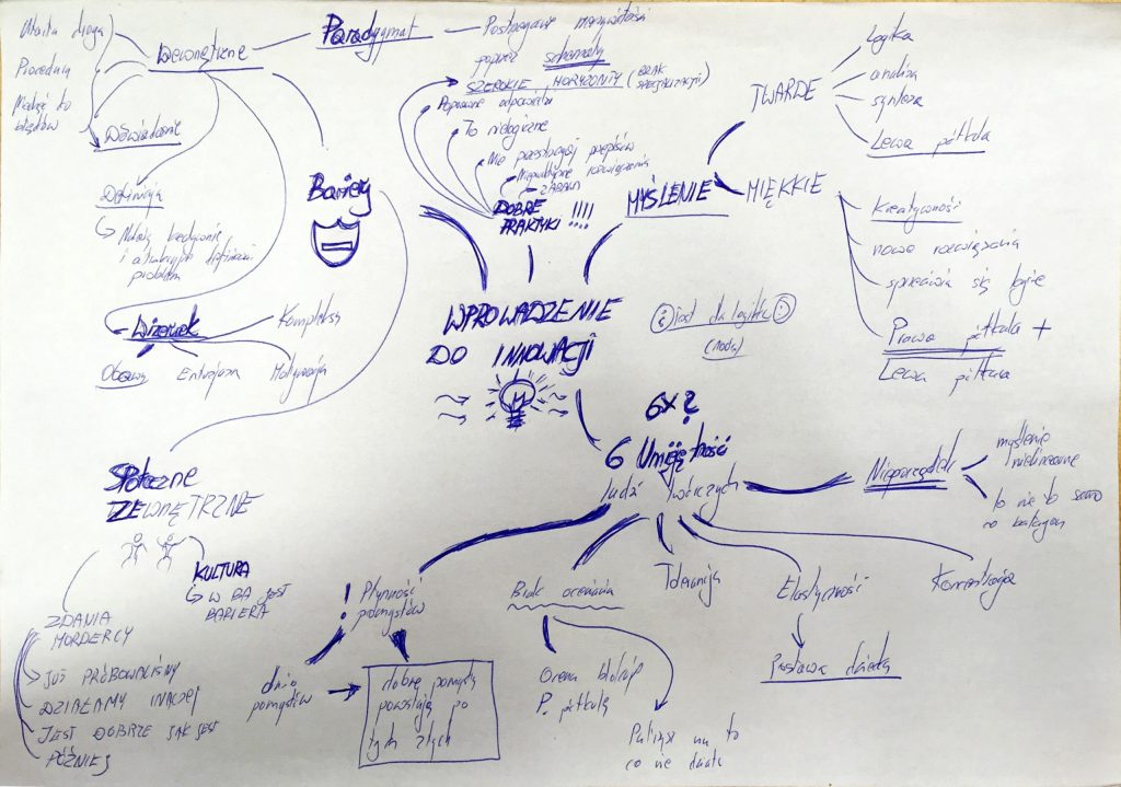 Poniżej prosty przykład naszkicowanej mapy wiele lat temu. Dziś wystarczy jeden rzut oka abym sobie całkiem nieźle przypomniał o czym było szkolenie. Dzięki złożonym połączeniom przy tworzeniu i czytaniu automatycznie aktywuje się prawa półkula co tylko pomaga.